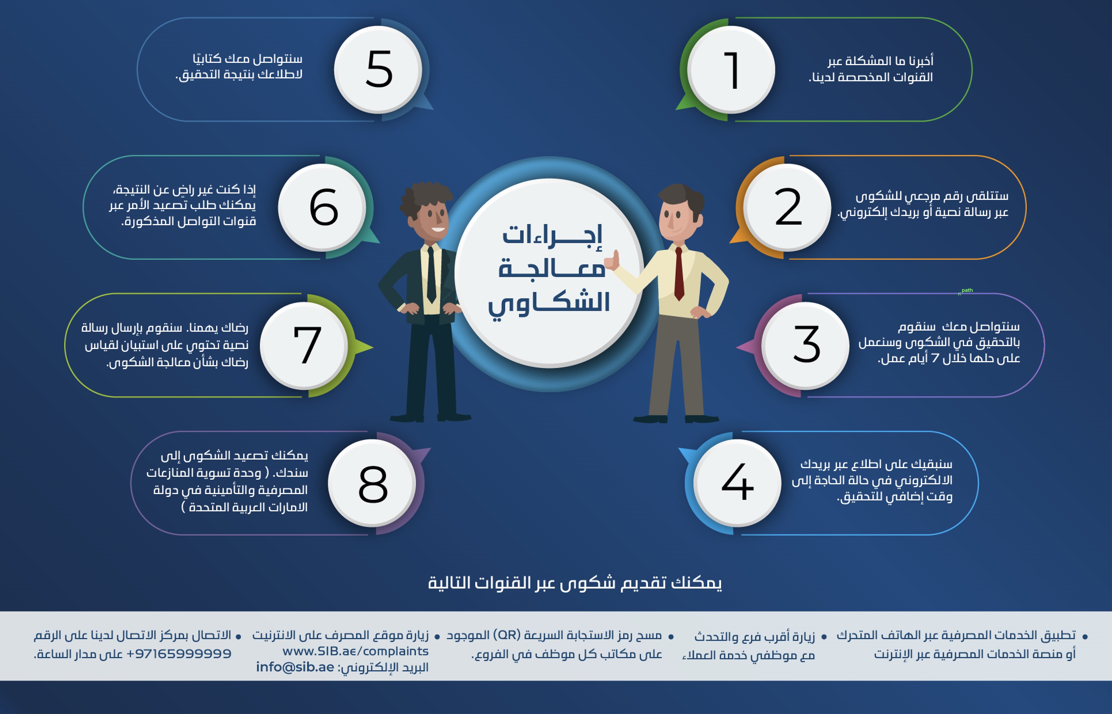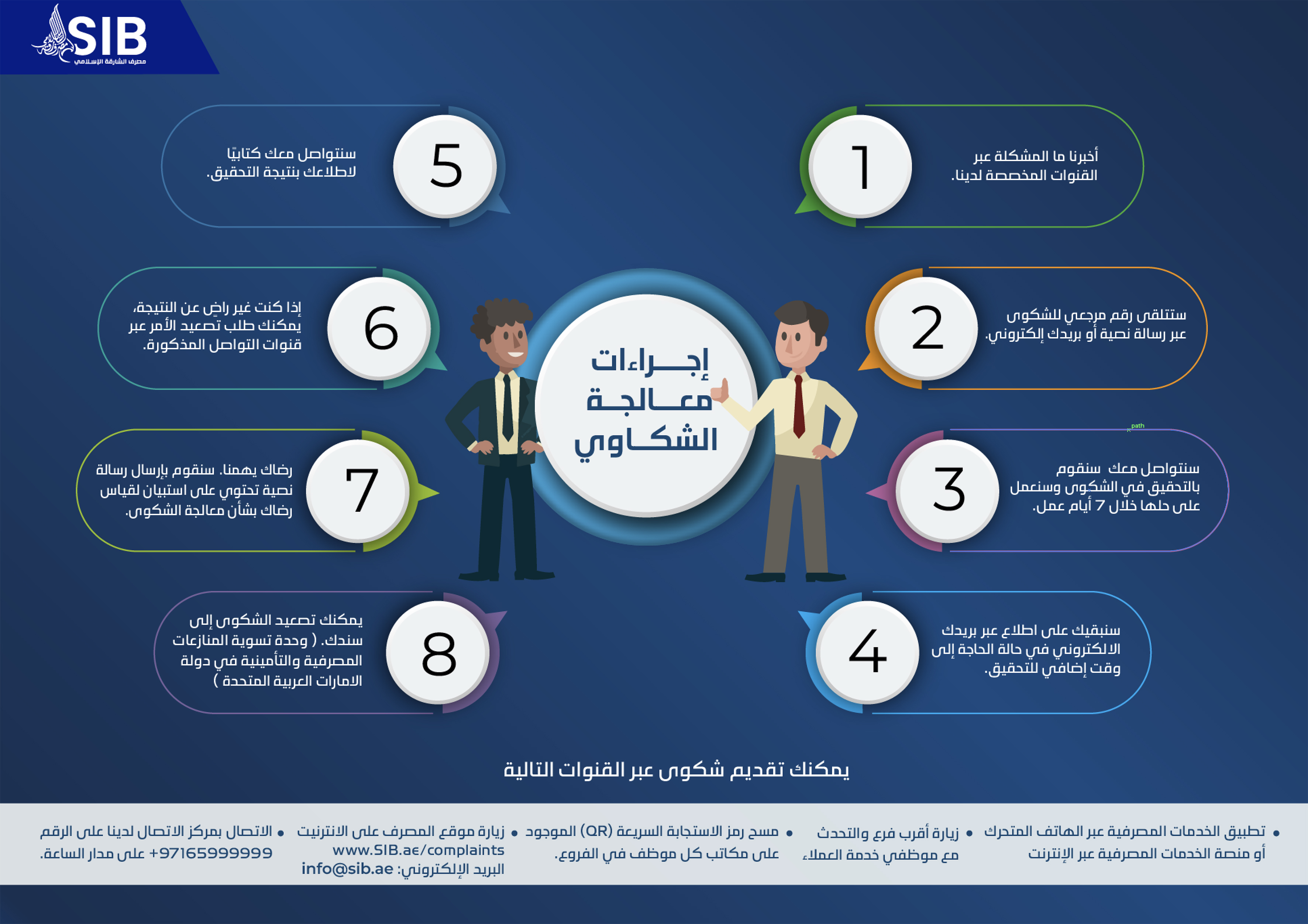 في مصرف الشارقة الإسلامي نلتزم بتقديم تجربة عملاء وفق أعلى المستويات. كما ندرك بأنه قد تكون هناك حالات يواجه فيها العملاء بعض الصعوبات أو المشاكل التي تتعلق بمنتجاتنا أو خدماتنا. في حال واجهت أية صعوبات، كن مطمئنًا بأننا حريصون على معالجة وحل أي شكاوى للعملاء بطريقة عادلة وفي أسرع وقت مُمكن وأن ملاحظاتك وتعليقاتك ذات أهمية قصوى بالنسبة لنا.
